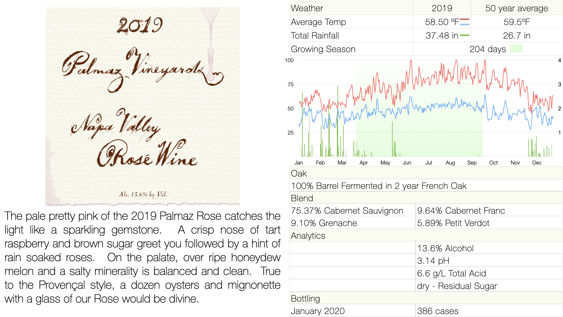The pale pretty pink of the 2019 Palmaz Rose catches the light like a sparkling gemstone. A crisp nose of tart raspberry and brown sugar greet you followed by a hint of rain soaked roses. On the palate, over ripe honeydew melon and a salty minerality is balanced and clean. True to the Provençal style, a dozen oysters and mignonette with a glass of our Rose would be divine.
