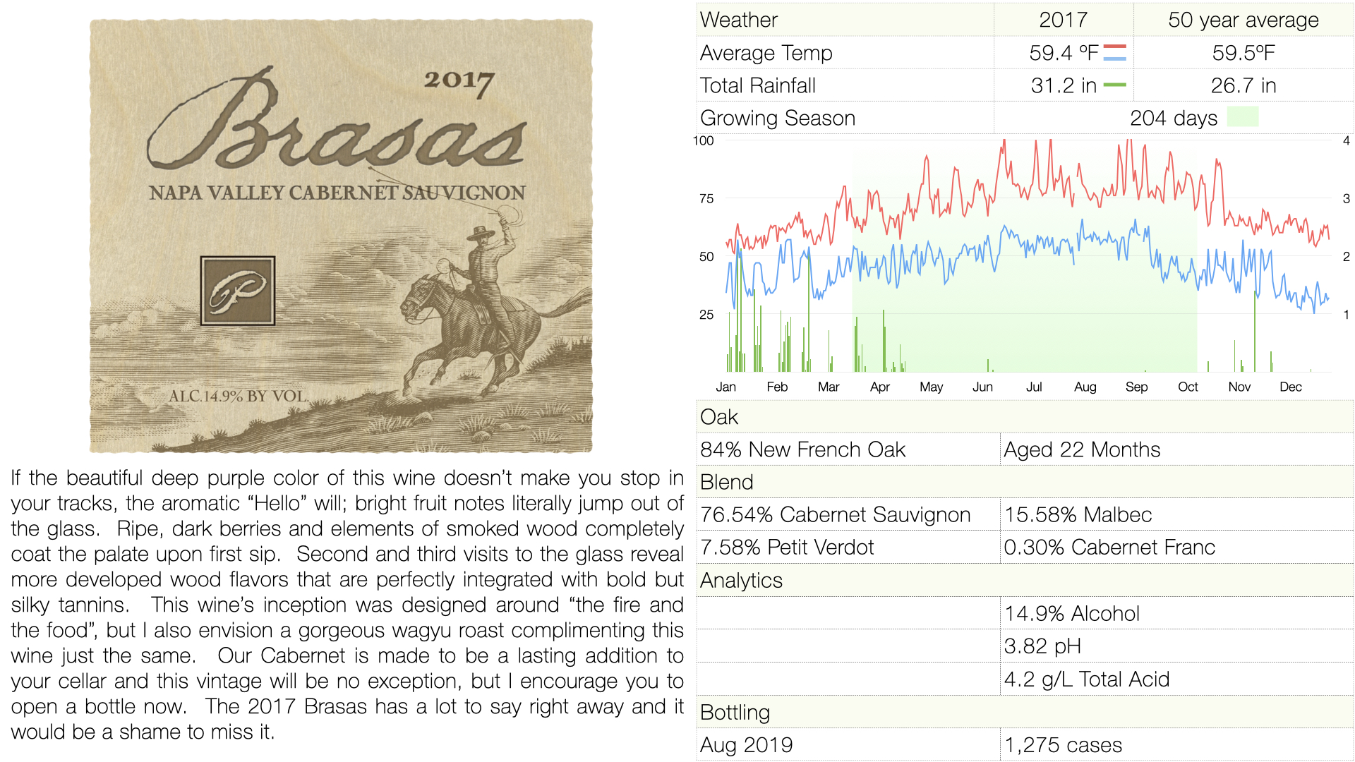 If the beautiful deep purple color of this wine doesn’t make you stop in your tracks, the aromatic “Hello” will; bright fruit notes literally jump out of the glass. Ripe, dark berries and elements of smoked wood completely coat the palate upon first sip. Second and third visits to the glass reveal more developed wood flavors that are perfectly integrated with bold but silky tannins. This wine’s inception was designed around “the fire and the food”, but I also envision a gorgeous wagyu roast complimenting this wine just the same. Our Cabernet is made to be a lasting addition to your cellar and this vintage will be no exception, but I encourage you to open a bottle now. The 2017 Brasas has a lot to say right away and it would be a shame to miss it.