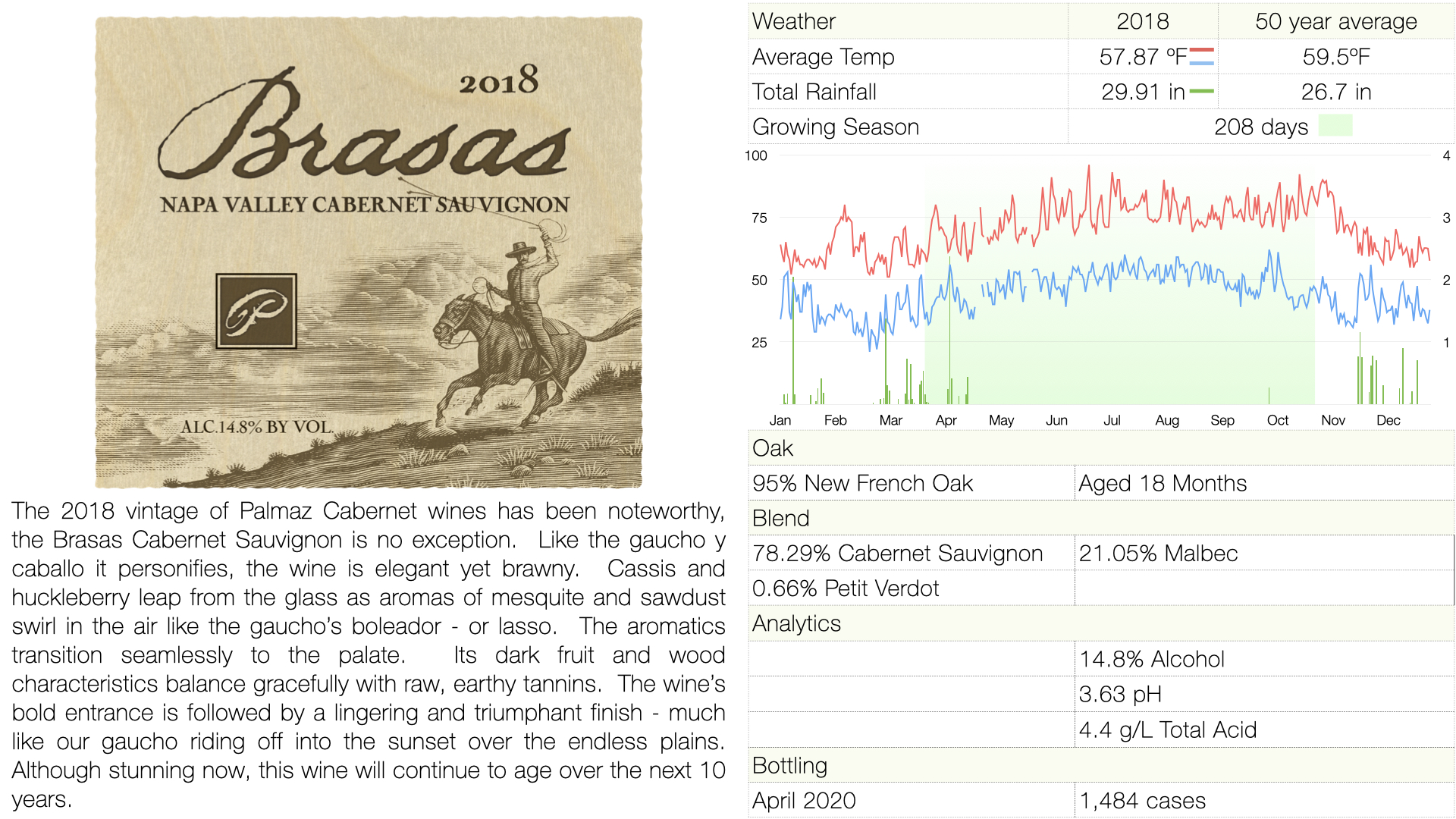 The 2018 vintage of Palmaz Cabernet wines has been noteworthy, the Brasas Cabernet Sauvignon is no exception. Like the gaucho y caballo it personifies, the wine is elegant yet brawny. Cassis and huckleberry leap from the glass as aromas of mesquite and sawdust swirl in the air like the gaucho’s boleador - or lasso. The aromatics transition seamlessly to the palate. Its dark fruit and wood characteristics balance gracefully with raw, earthy tannins. The wine’s bold entrance is followed by a lingering and triumphant finish - much like our gaucho riding off into the sunset over the endless plains. Although stunning now, this wine will continue to age over the next 10 years.