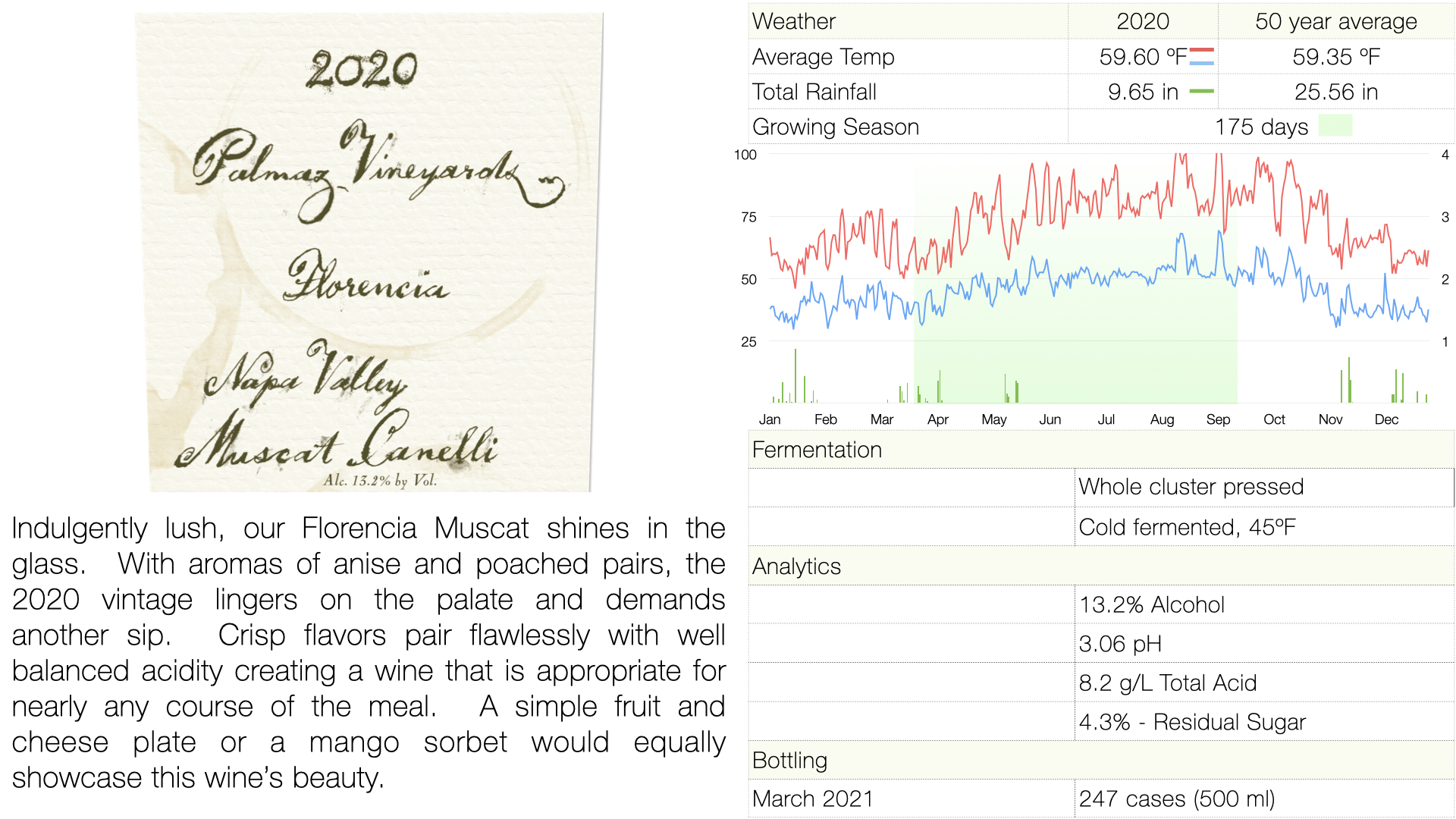 Indulgently lush, our Florencia Muscat shines in the glass. With aromas of anise and poached pears, the 2020 vintage lingers on the palate and demands another sip. Crisp flavors pair flawlessly with well balanced acidity creating a wine that is appropriate for nearly any course of the meal. A simple fruit and cheese plate or a mango sorbet would equally showcase this wine’s beauty.