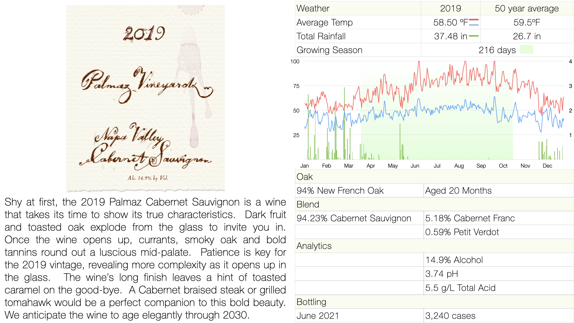Shy at first, the 2019 Palmaz Cabernet Sauvignon is a wine that takes its time to show its true characteristics. Dark fruit and toasted oak explode from the glass to invite you in. Once the wine opens up, currants, smoky oak and bold tannins round out a luscious mid-palate. Patience is key for the 2019 vintage, revealing more complexity as it opens up in the glass. The wine’s long finish leaves a hint of toasted caramel on the good-bye. A Cabernet braised steak or grilled tomahawk would be a perfect companion to this bold beauty. We anticipate the wine to age elegantly through 2030.
