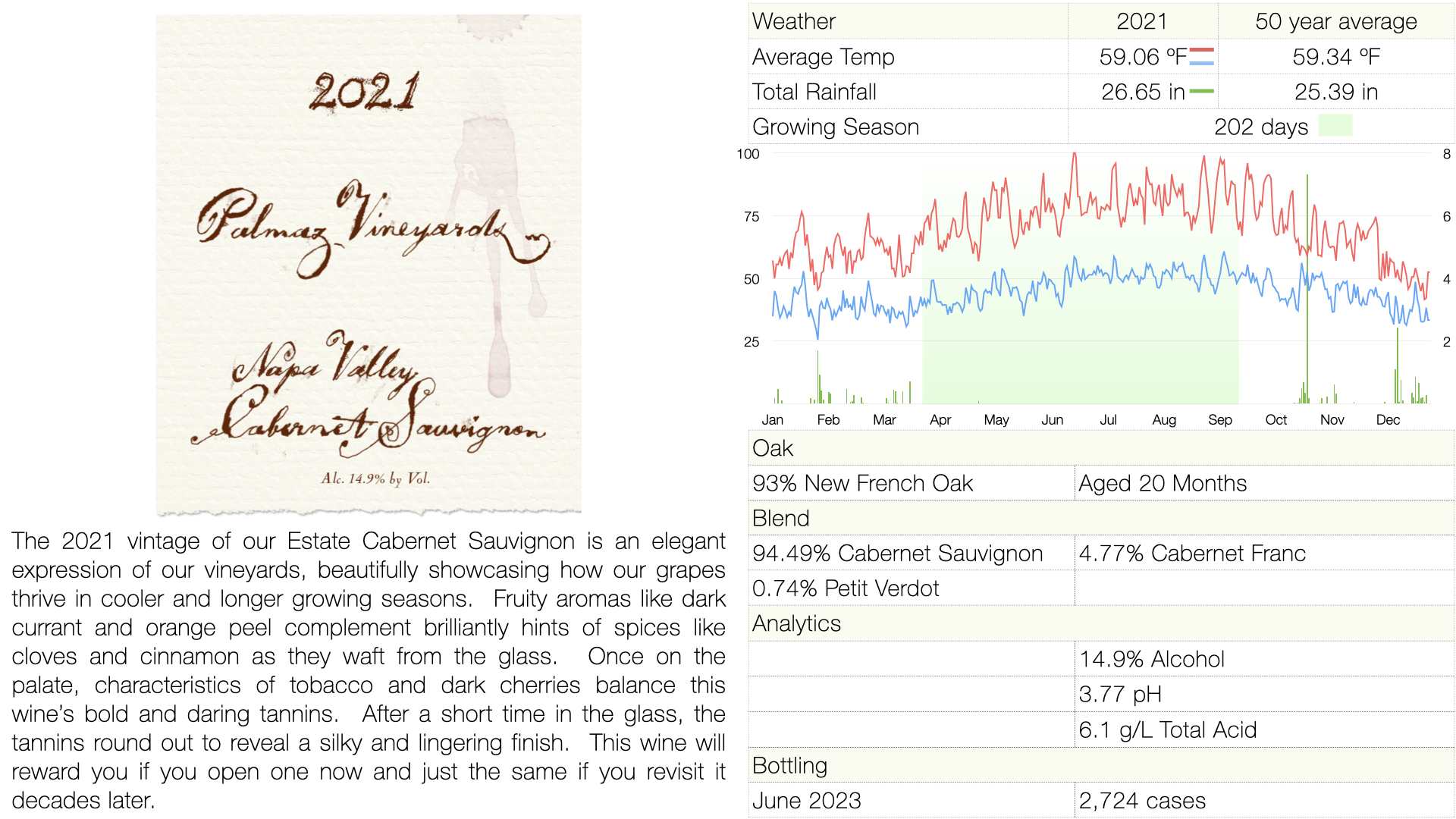 OAK:93% New French Oak BLEND:94.49% Cabernet Sauvignon ANALYTICS:14.9% Alcohol BOTTLING:June 2023 |