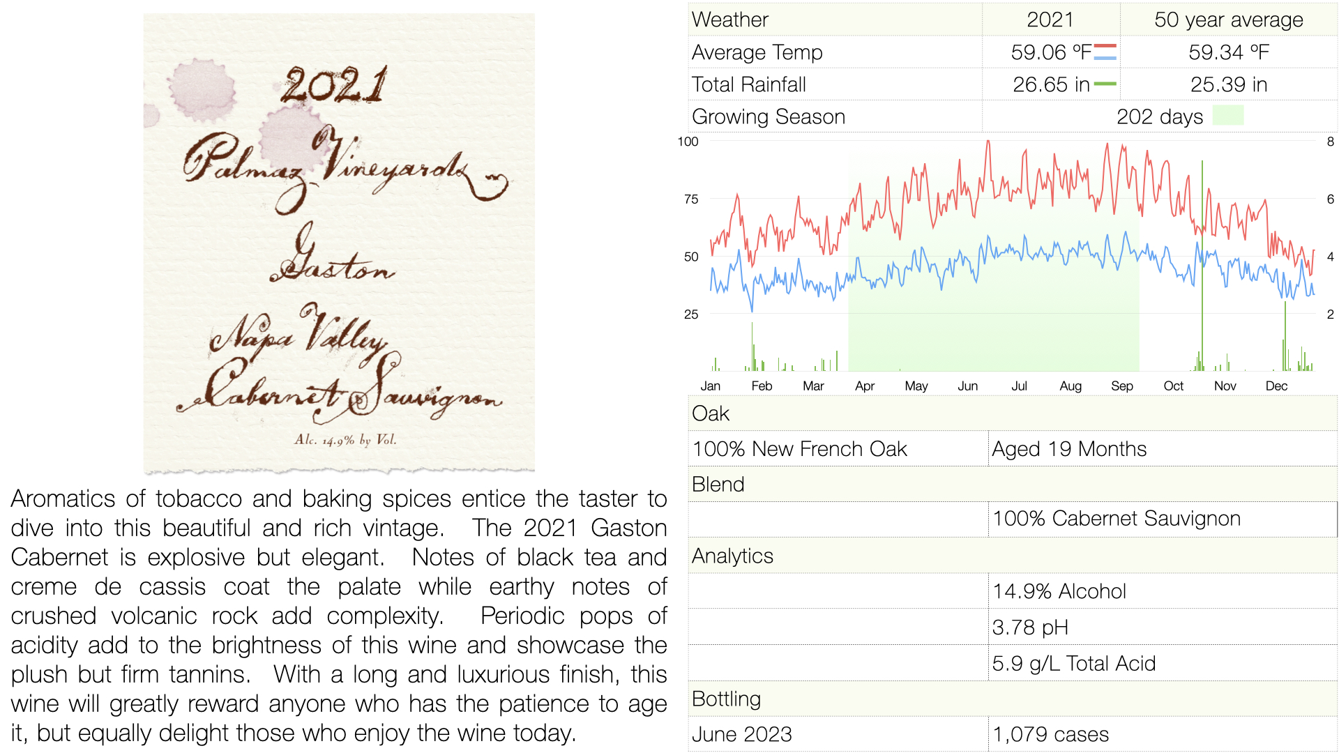 Aromatics of tobacco and baking spices entice the taster to dive into this beautiful and rich vintage. The 2021 Gaston Cabernet is explosive but elegant. Notes of black tea and creme de cassis coat the palate while earthy notes of crushed volcanic rock add complexity. Periodic pops of acidity add to the brightness of this wine and showcase the plush but firm tannins. With a long and luxurious finish, this wine will greatly reward anyone who has the patience to age it, but equally delight those who enjoy the wine today.