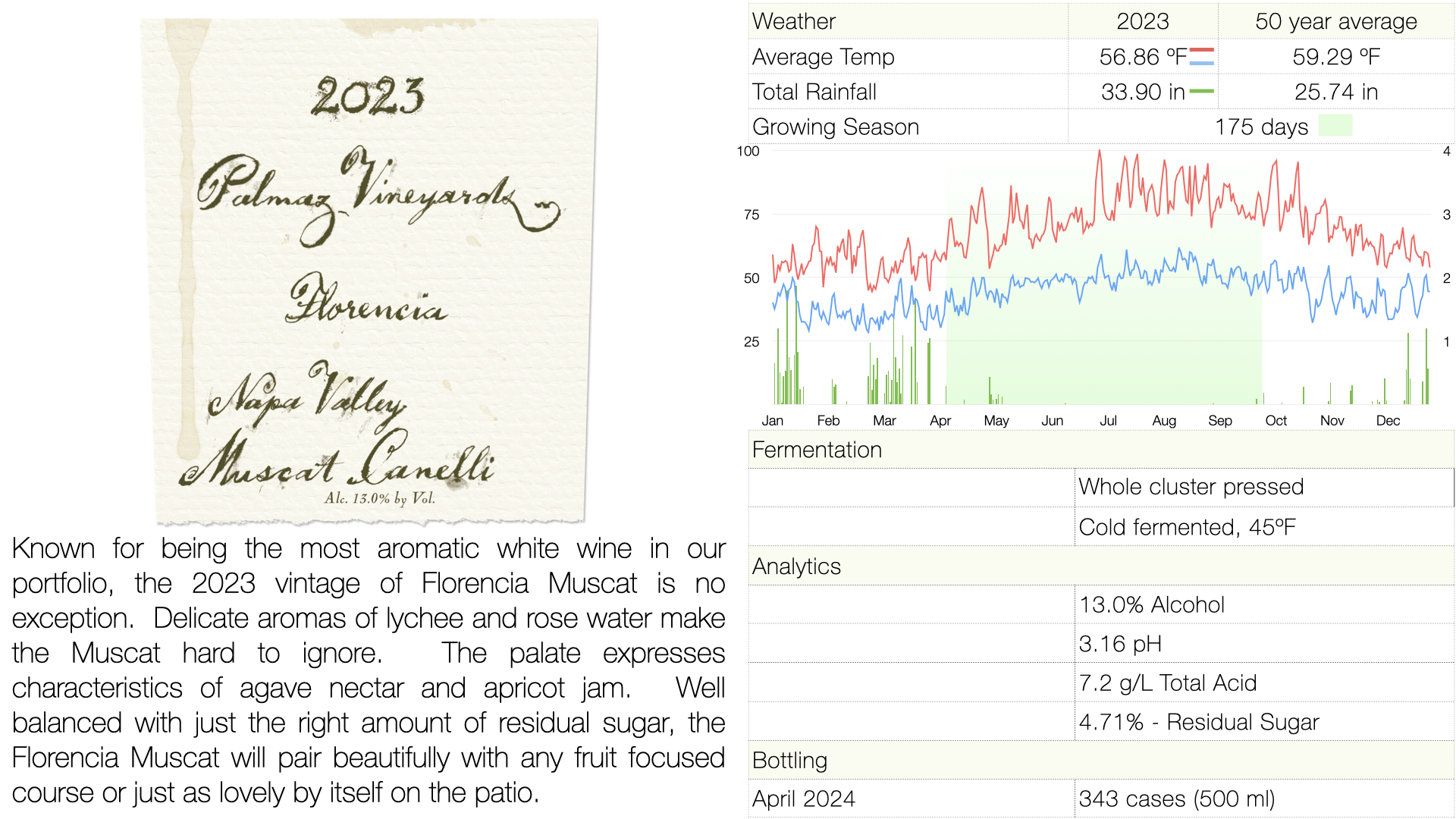 Known for being the most aromatic white wine in our portfolio, the 2023 vintage of Florencia Muscat is no exception. Delicate aromas of lychee and rose water make the Muscat hard to ignore. The palate expresses characteristics of agave nectar and apricot jam. Well balanced with just the right amount of residual sugar, the Florencia Muscat will pair beautifully with any fruit focused course or just as lovely by itself on the patio.