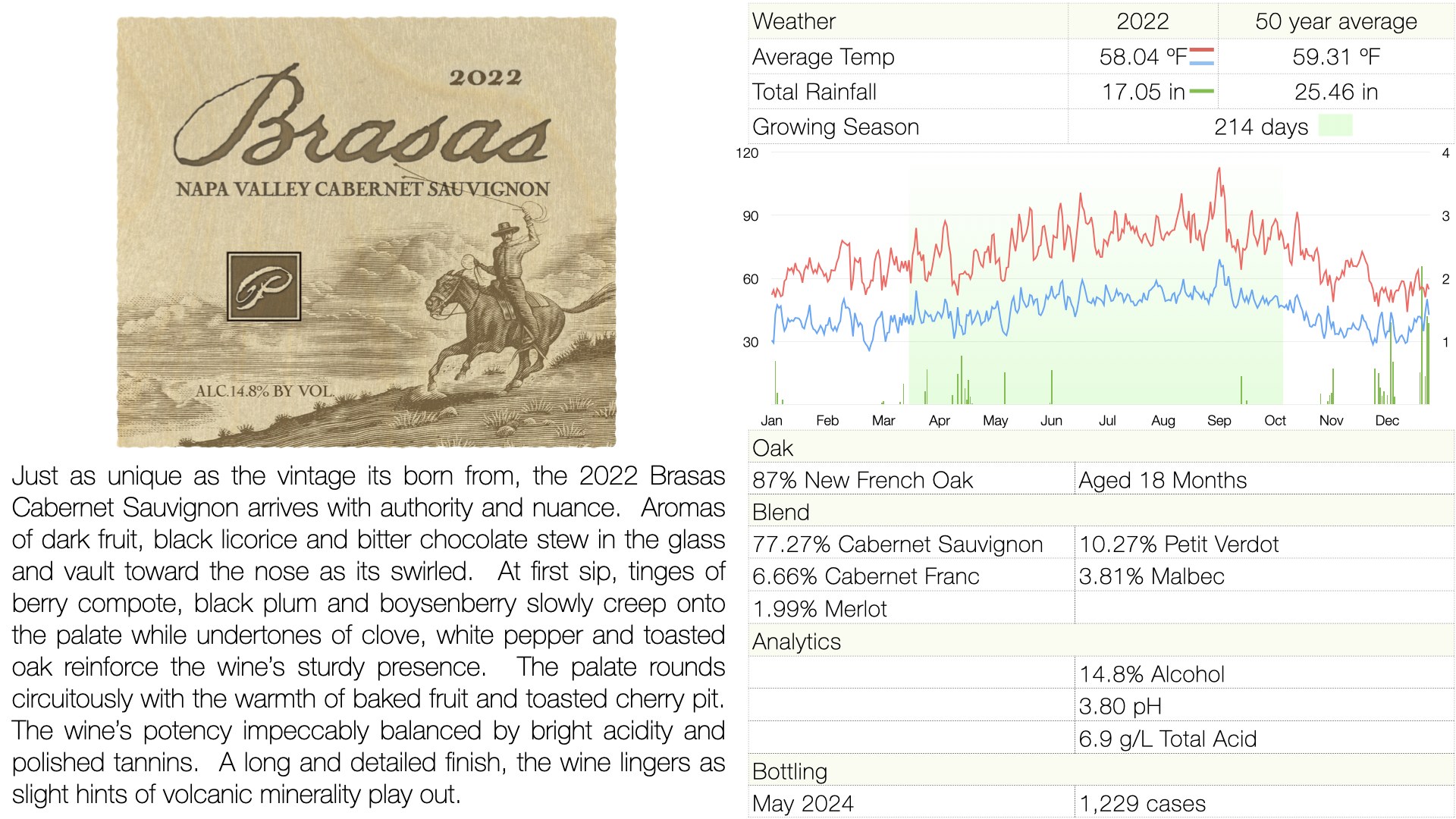 Just as unique as the vintage its born from, the 2022 Brasas Cabernet Sauvignon arrives with authority and nuance.  Aromas of dark fruit, black licorice and bitter chocolate stew in the glass and vault toward the nose as its swirled.  At first sip, tinges of berry compote, black plum and boysenberry slowly creep onto the palate while undertones of clove, white pepper and toasted oak reinforce the wine’s sturdy presence.  The palate rounds circuitously with the warmth of baked fruit and toasted cherry pit.  The wine’s potency impeccably balanced by bright acidity and polished tannins.  A long and detailed finish, the wine lingers as slight hints of volcanic minerality play out.