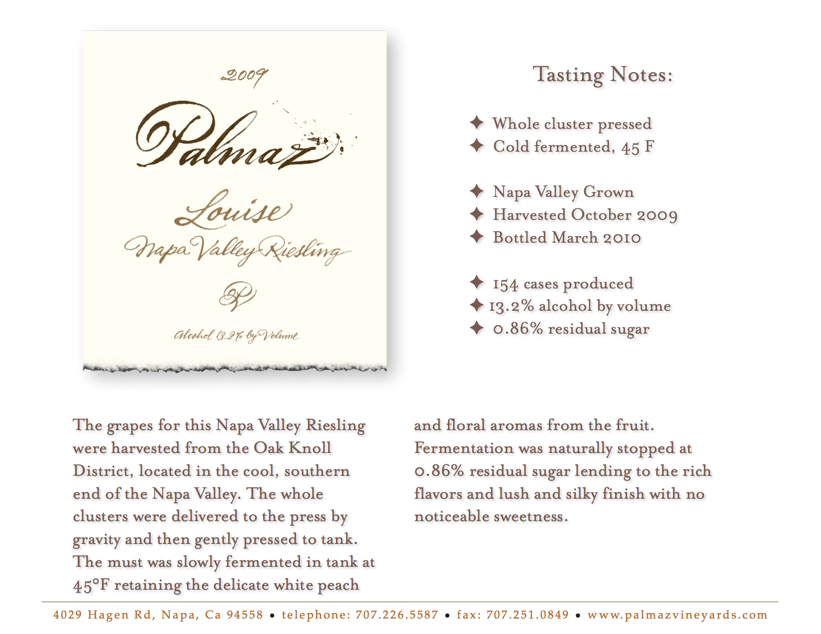 The late-October rain that plagued so many Napa vintners in 2009 had no impact on the Riesling fruit, which was harvested well before the showers fell. In fact, the temperate summer of 2009 resulted in a wine of great refinement and complexity. The delicate aromas of lime zest and pear complement the uplifting hints of freshly cut grass. The strong finish makes this vintage a perfect wine to balance rich dishes such as brie-and-onion tarts, or indulgent macaroni and cheese with lobster.