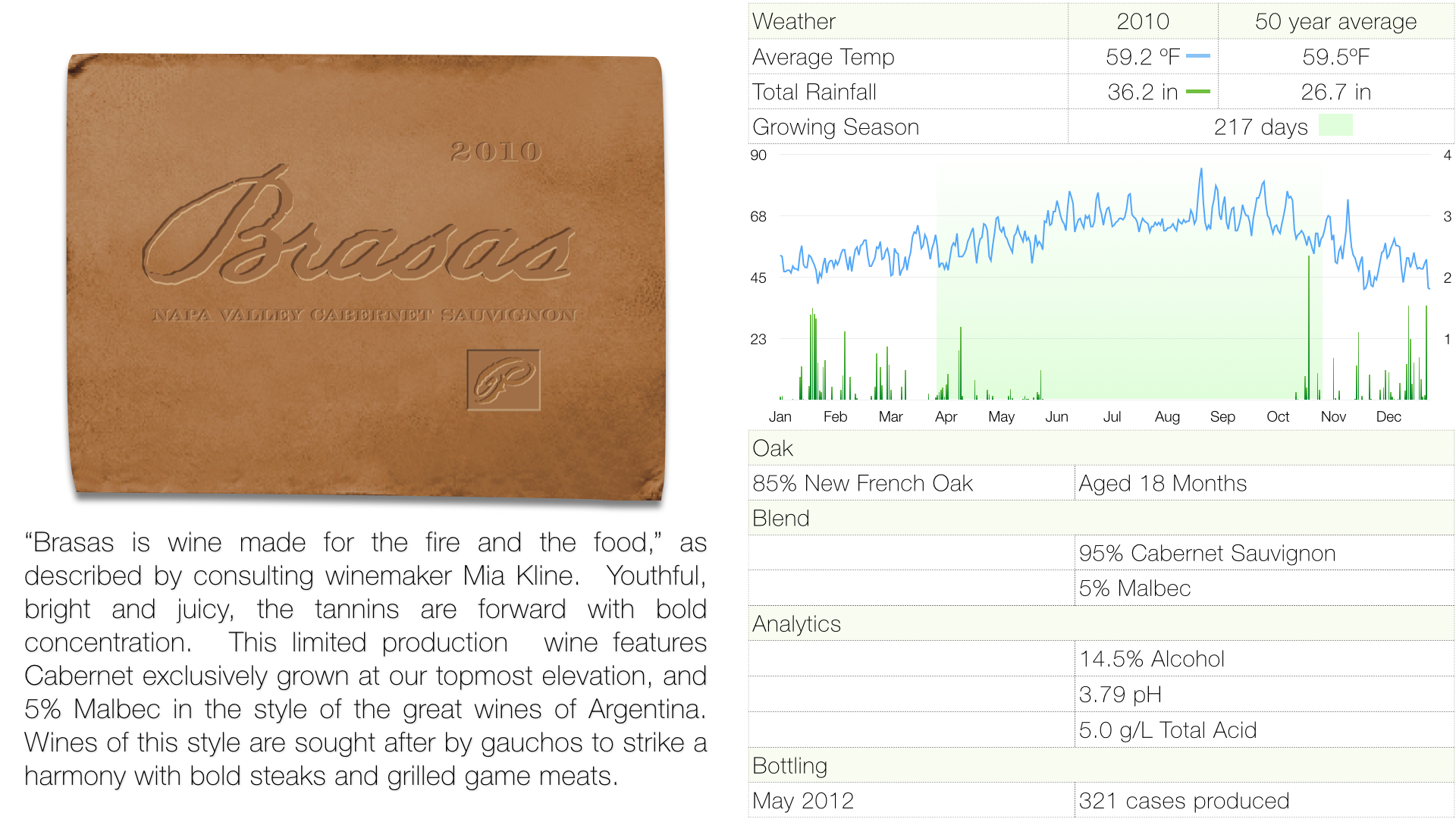 OAK:85% New French Oak BLEND:95% Cabernet Sauvignon ANALYTICS:14.5% Alcohol BOTTLING:May 2012 |