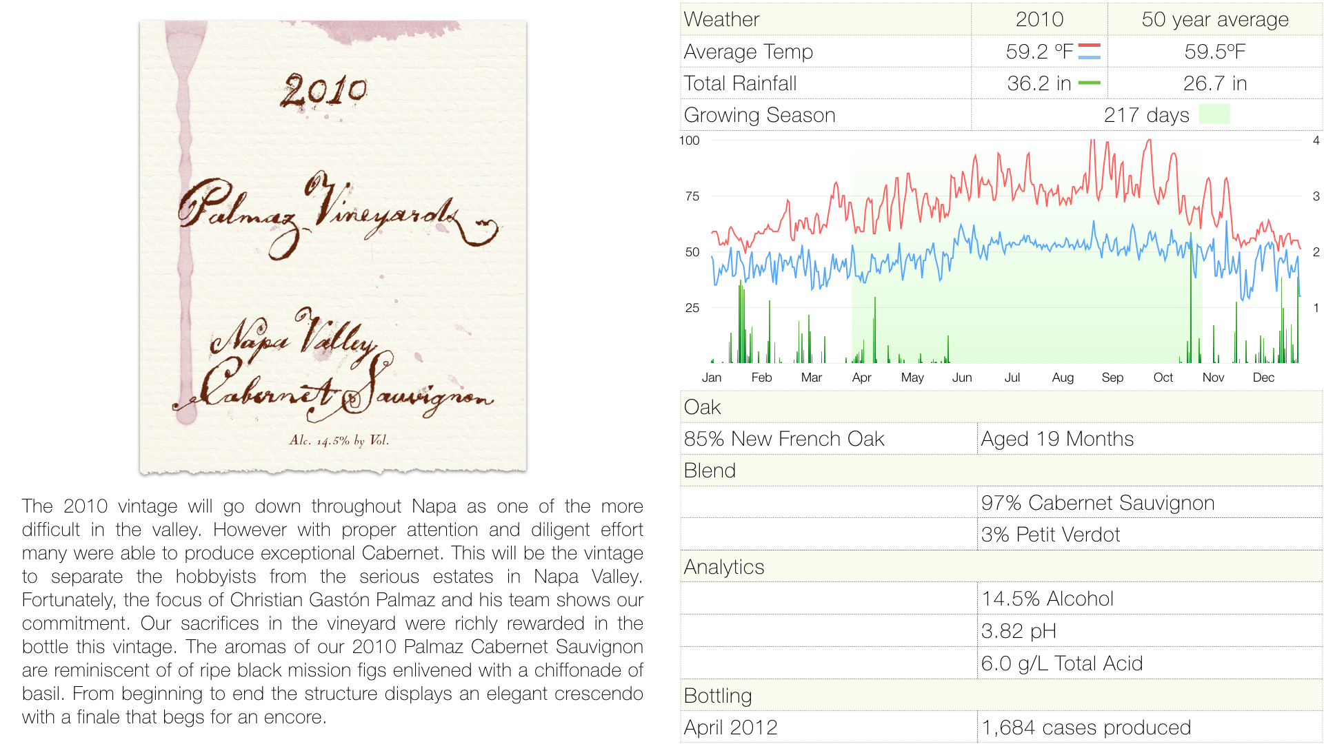 OAK:85% New French Oak BLEND:97% Cabernet Sauvignon ANALYTICS:14.5% Alcohol BOTTLING:April 2012 |