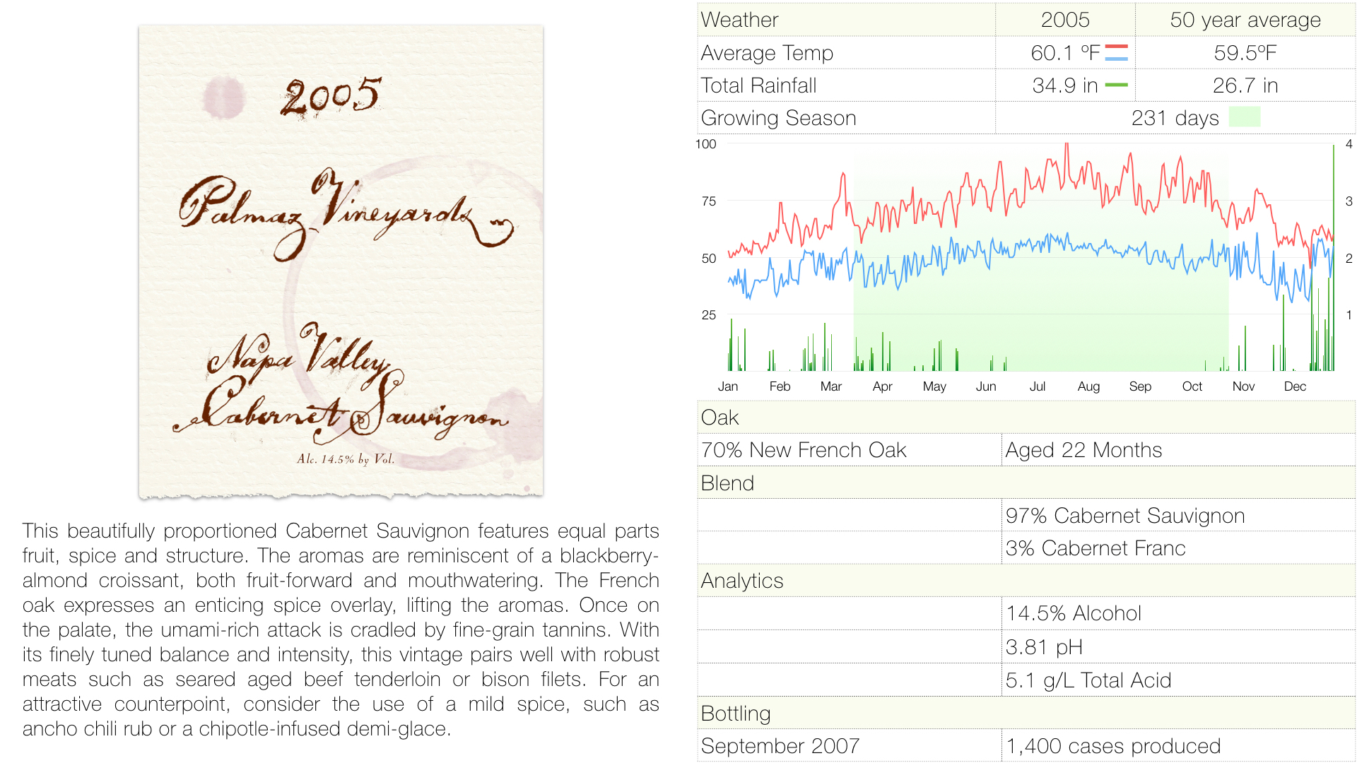 OAK:70% New French Oak BLEND:97% Cabernet Sauvignon ANALYTICS:14.5% Alcohol BOTTLING:September 2007 |