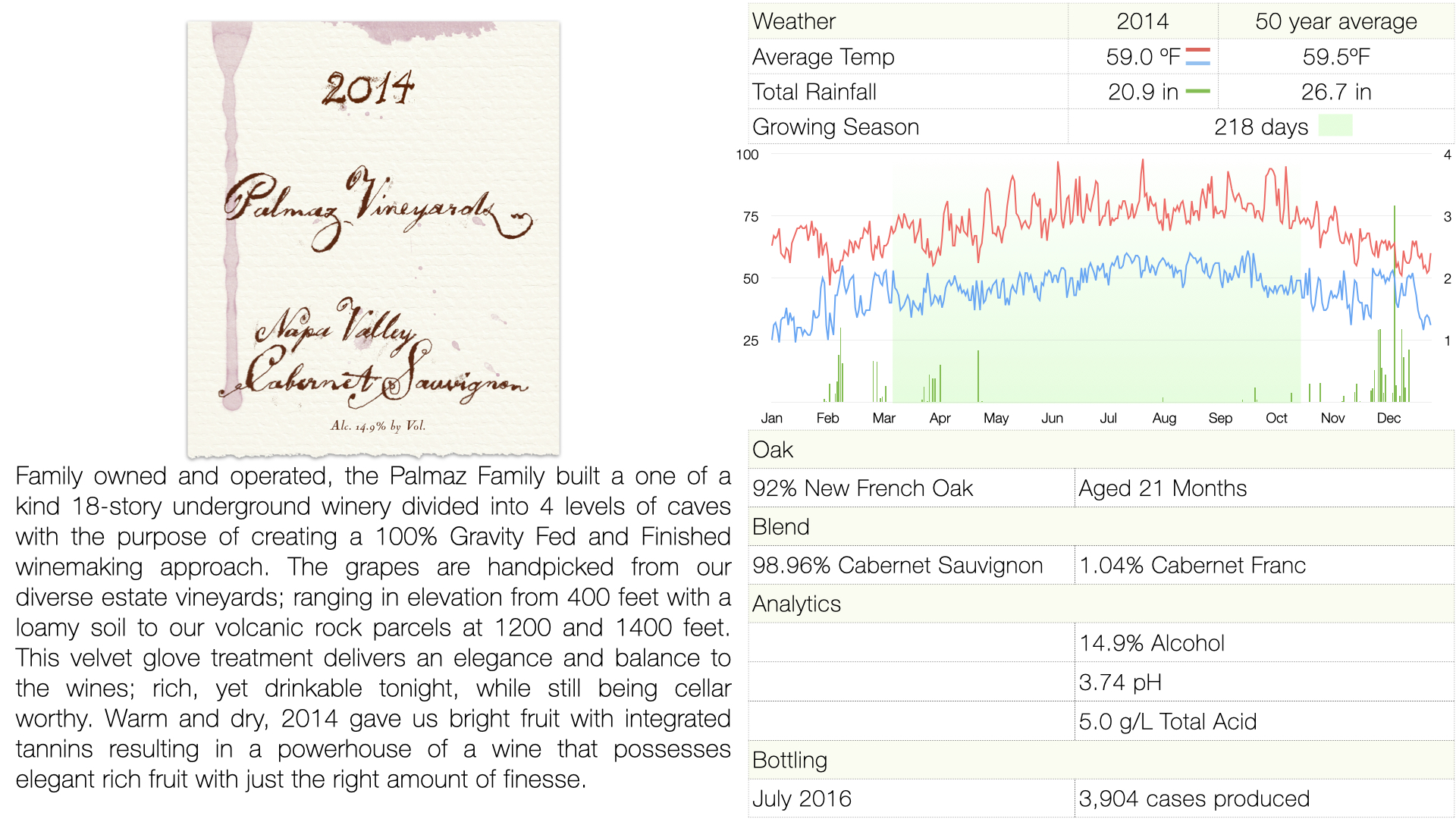 OAK:92% New French Oak BLEND:98.96% Cabernet Sauvignon ANALYTICS:14.9% Alcohol BOTTLING:July 2016 |