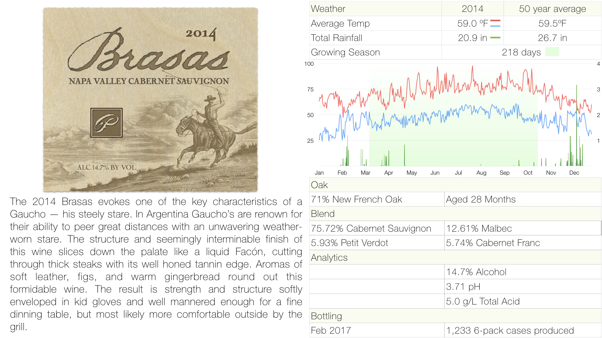 The 2014 Brasas evokes one of the key characteristics of a Gaucho — his steely stare. In Argentina Gaucho’s are renown for their ability to peer great distances with an unwavering weather-worn stare. The structure and seemingly interminable finish of this wine slices down the palate like a liquid Facón, cutting through thick steaks with its well honed tannin edge. Aromas of soft leather, figs, and warm gingerbread round out this formidable wine. The result is strength and structure softly enveloped in kid gloves and well mannered enough for a fine dinning table, but most likely more comfortable outside by the grill.
